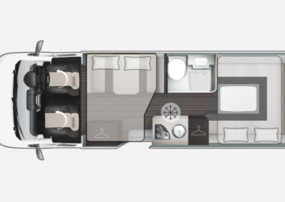 Beds – 1 king rear lounge convert, 1 double elevating snug double & dinette single convert